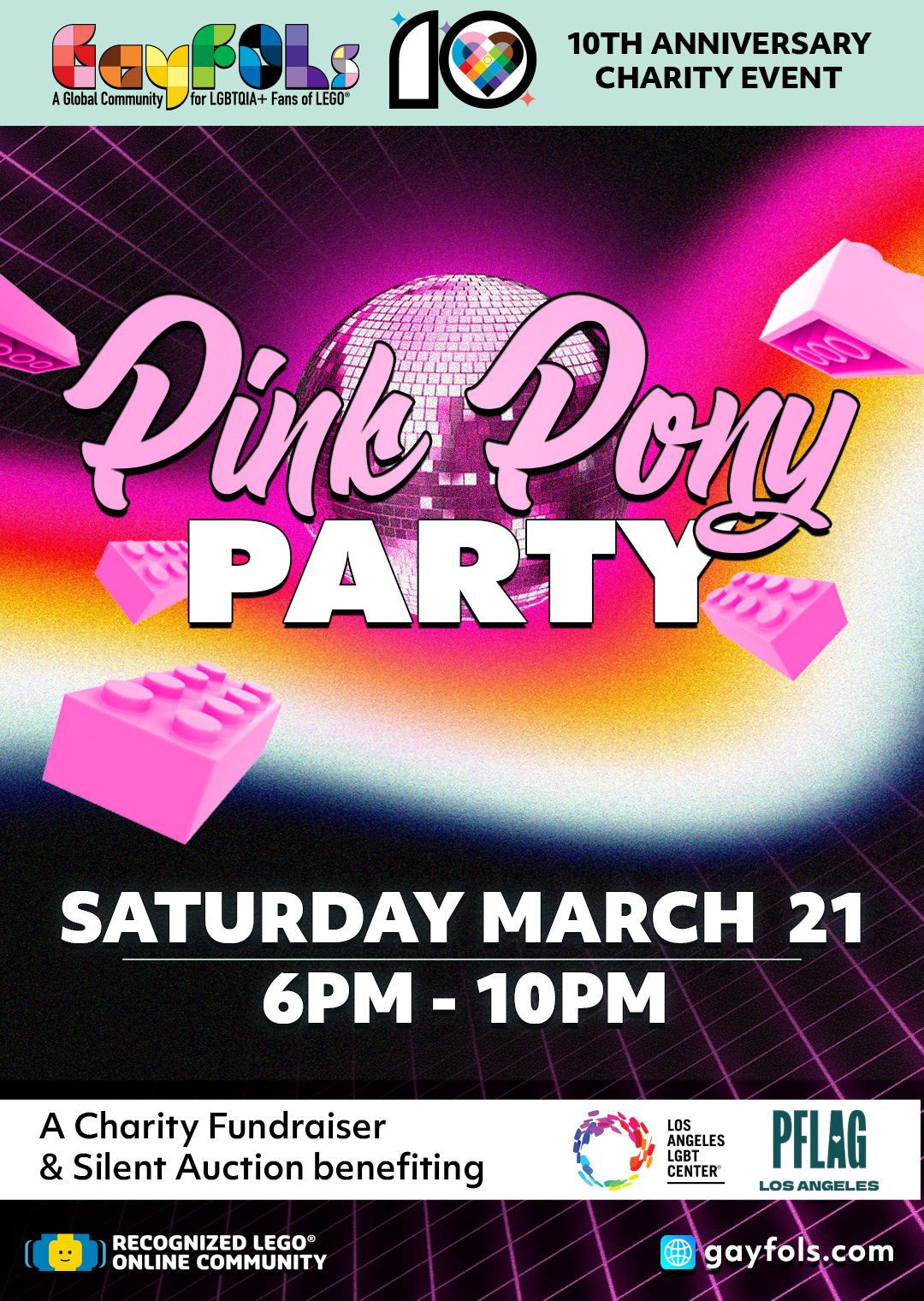 Join us on Saturday night for an evening of dancing, drinking, and fun as we celebrate our 10th anniversary. Celebrate your identity! Celebrate diversity! Celebrate love! The Pink Pony Party is a fundraiser for GayFOLs, as well as the Los Angeles LGBT Center, and PFLAG (Parents and Friends of Lesbians and Gays), with 20% of ticket sales going to GayFOLs, and 40% each to the other two organizations. Show your support for LGBTQIA+ community services by joining us. We will also have a silent auction of LEGO sets and other fun stuff.